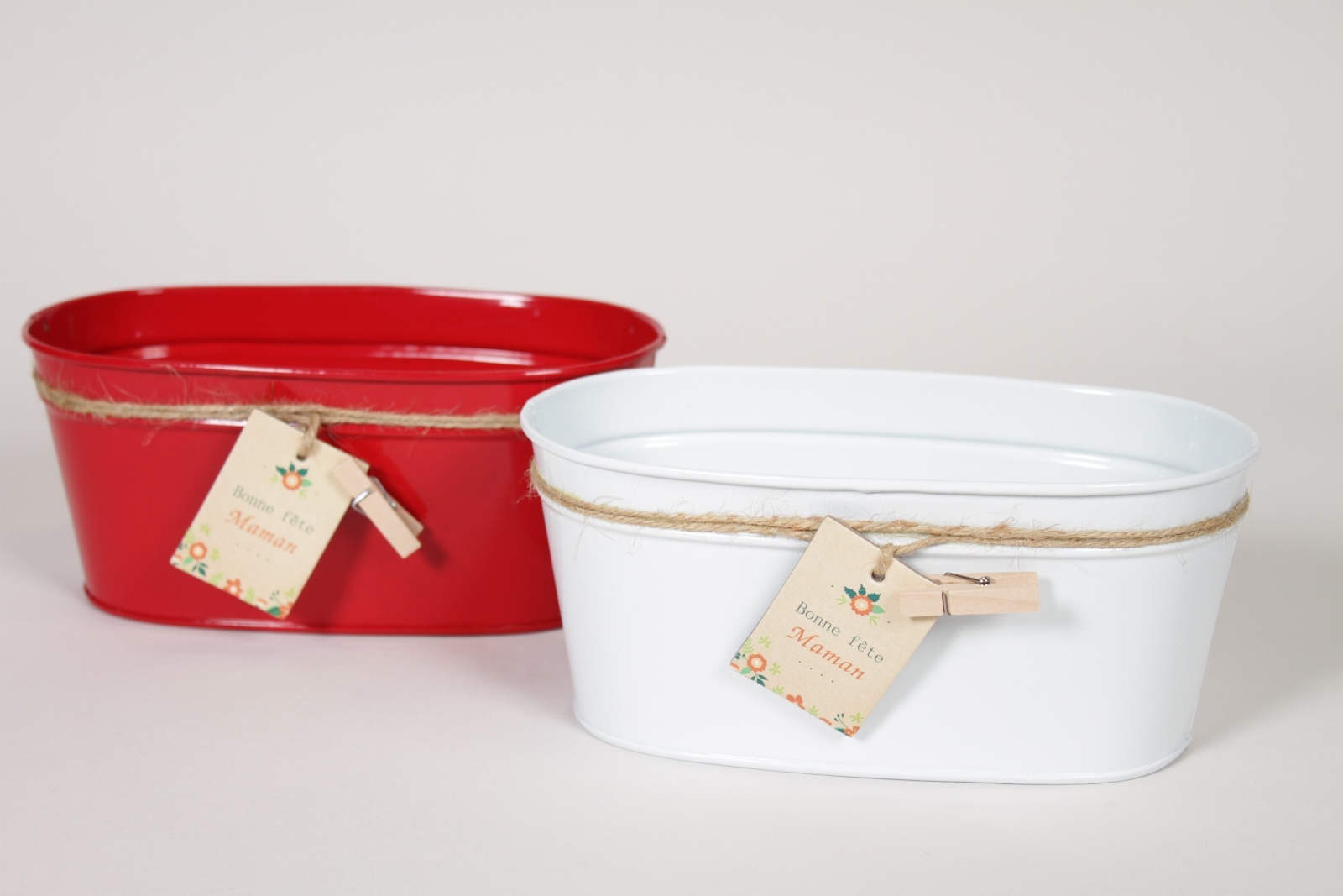 Red or white zinc planter with matching "Bonne fête Maman" card and wooden clip. Length 20cm, width 11cm, height 9cm.