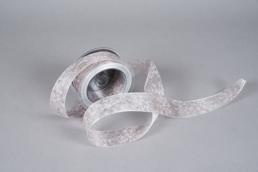 Ruban gris à motifs flocon argent pailletés largeur 40mm longueur 25m