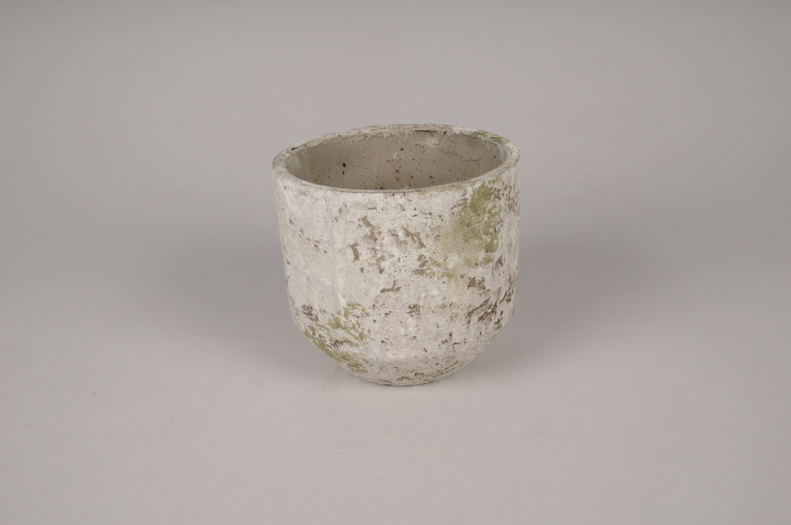 Green and grey rustic concrete planter diameter 17cm height 15.5cmInside diameter 15.5cmBase diameter 10.5cm