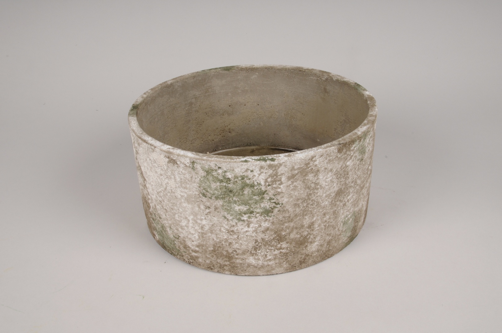 Green, white and light brown round rustic concrete planter diameter 25.5cm height 12.5cmInside diameter 23.5cm