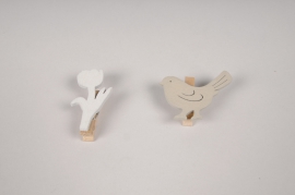 Sachet de 6 pinces en bois assorties avec oiseaux gris et fleurs blanches