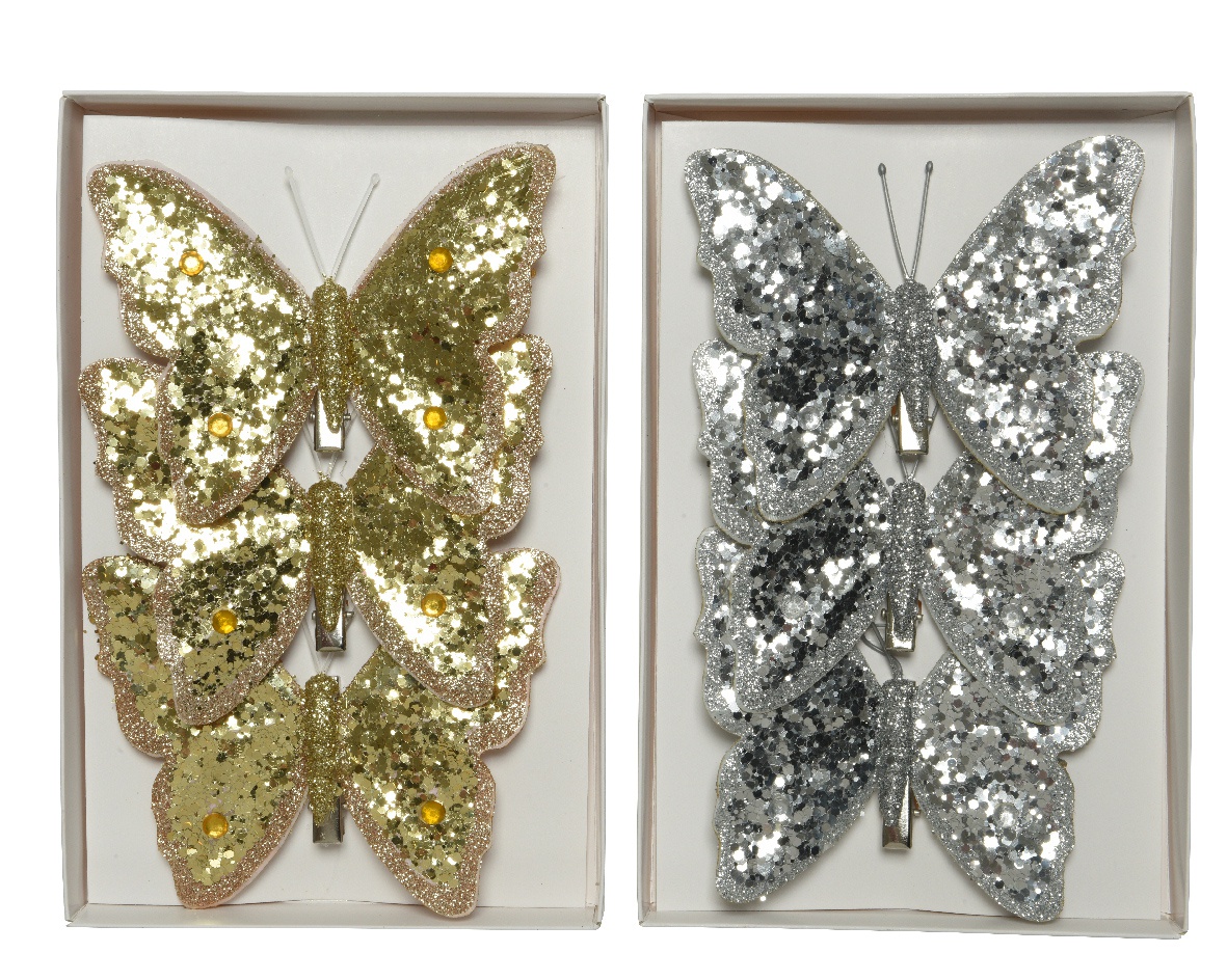 Réf. : KI-000380 Set de 3 papillons en plastique avec perles sur fil or ou argent assorti largeur 13cm hauteur 20cm