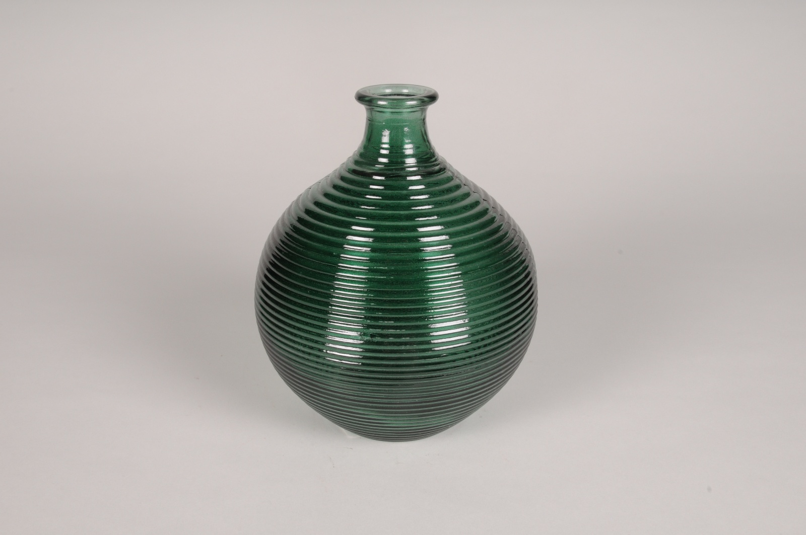 Vase bouteille en verre strié vert diamètre 16.5cm hauteur 20cm