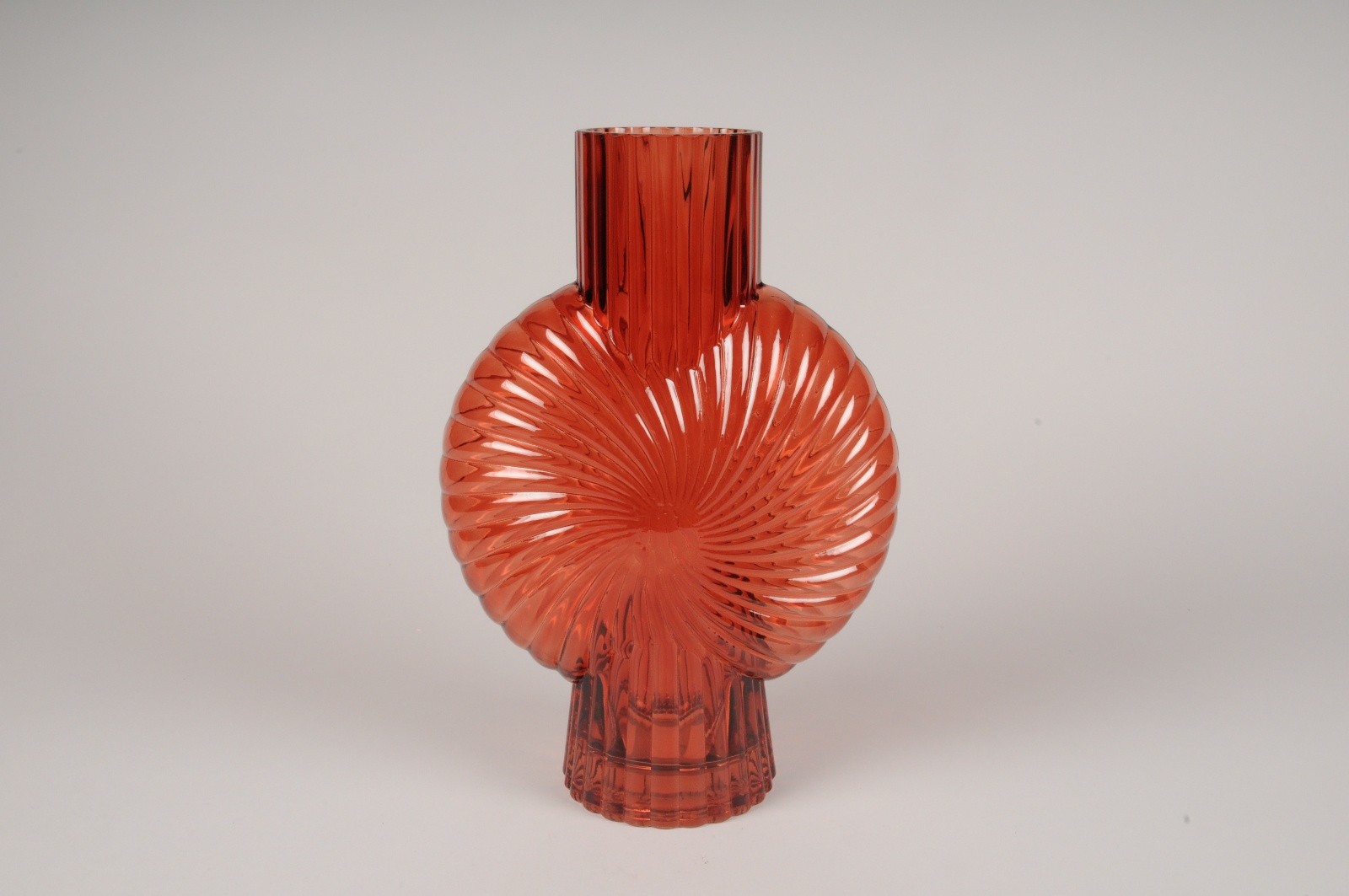 Vase en verre nervuré rouge au style art déco vintage diamètre 22 cm largeur 10.5cm hauteur 32cm