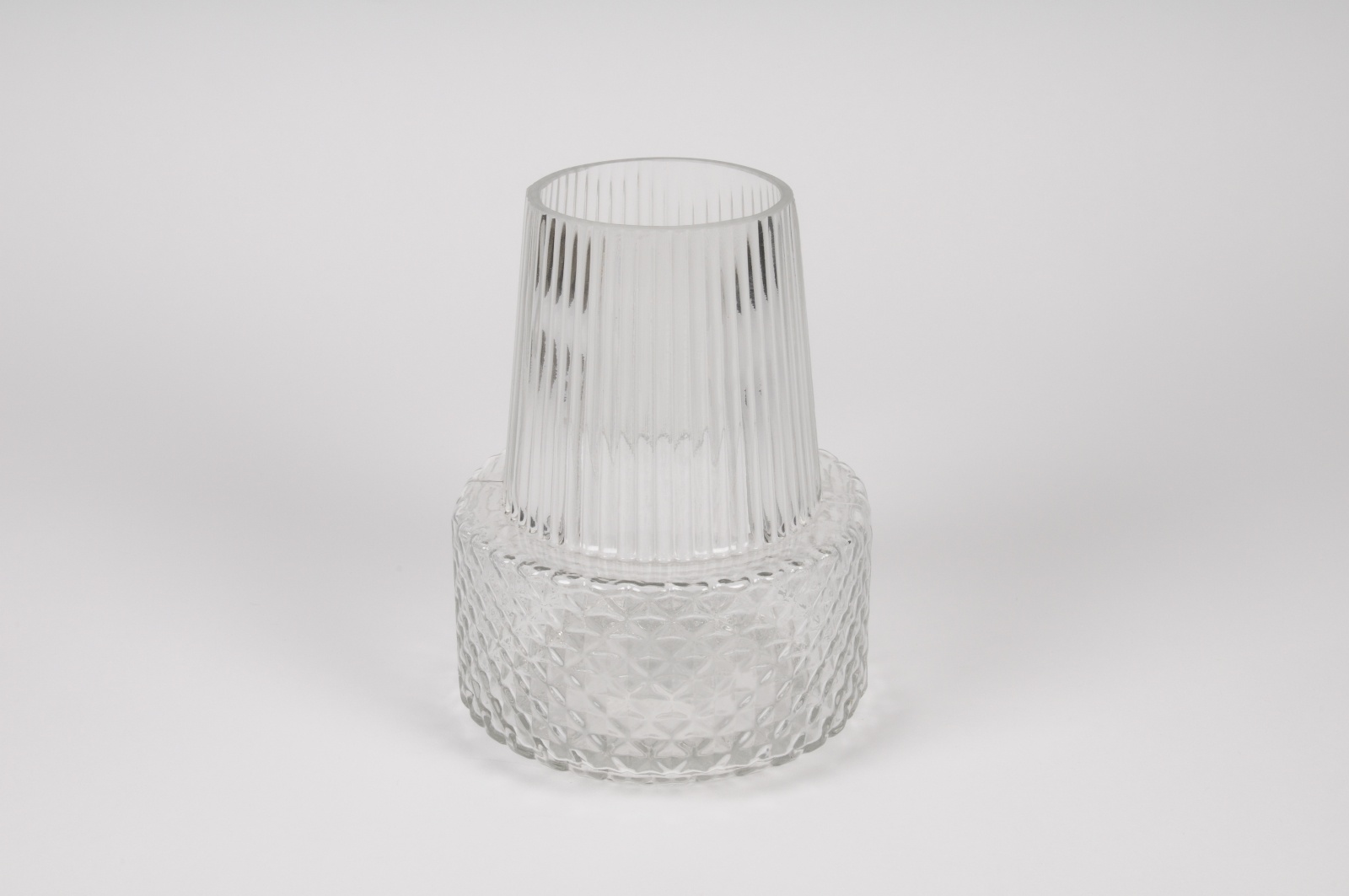 Vase en verre strié transparent avec motif quadrillage sur la base diamètre 13cm hauteur 18.5cm