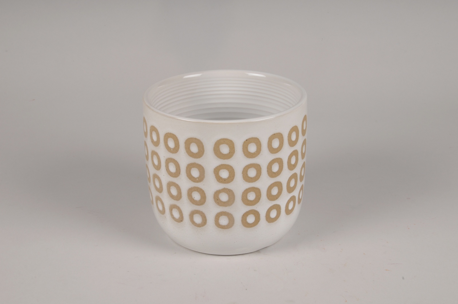 White ceramic planter with beige circles patterns diameter 15cm height 13.5cmInside diameter 13.5cm