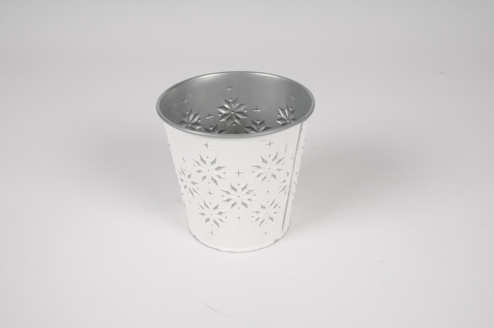 White zinc planter with silver snowflakes patterns diameter 11cm height 10.5cmBase diameter 8cm