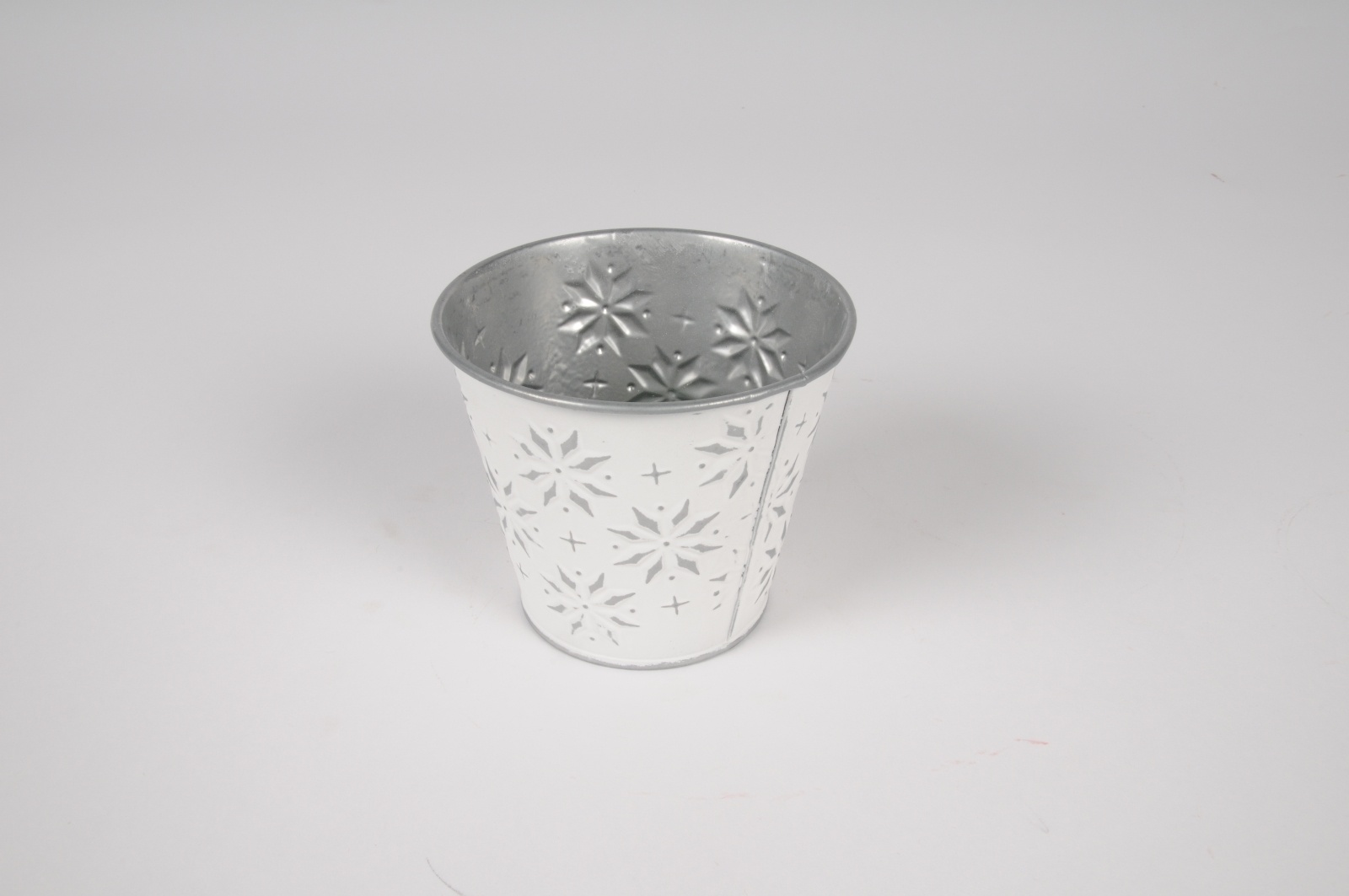 White zinc planter with silver snowflakes patterns diameter 8.5cm height 8cmBase diameter 6cm