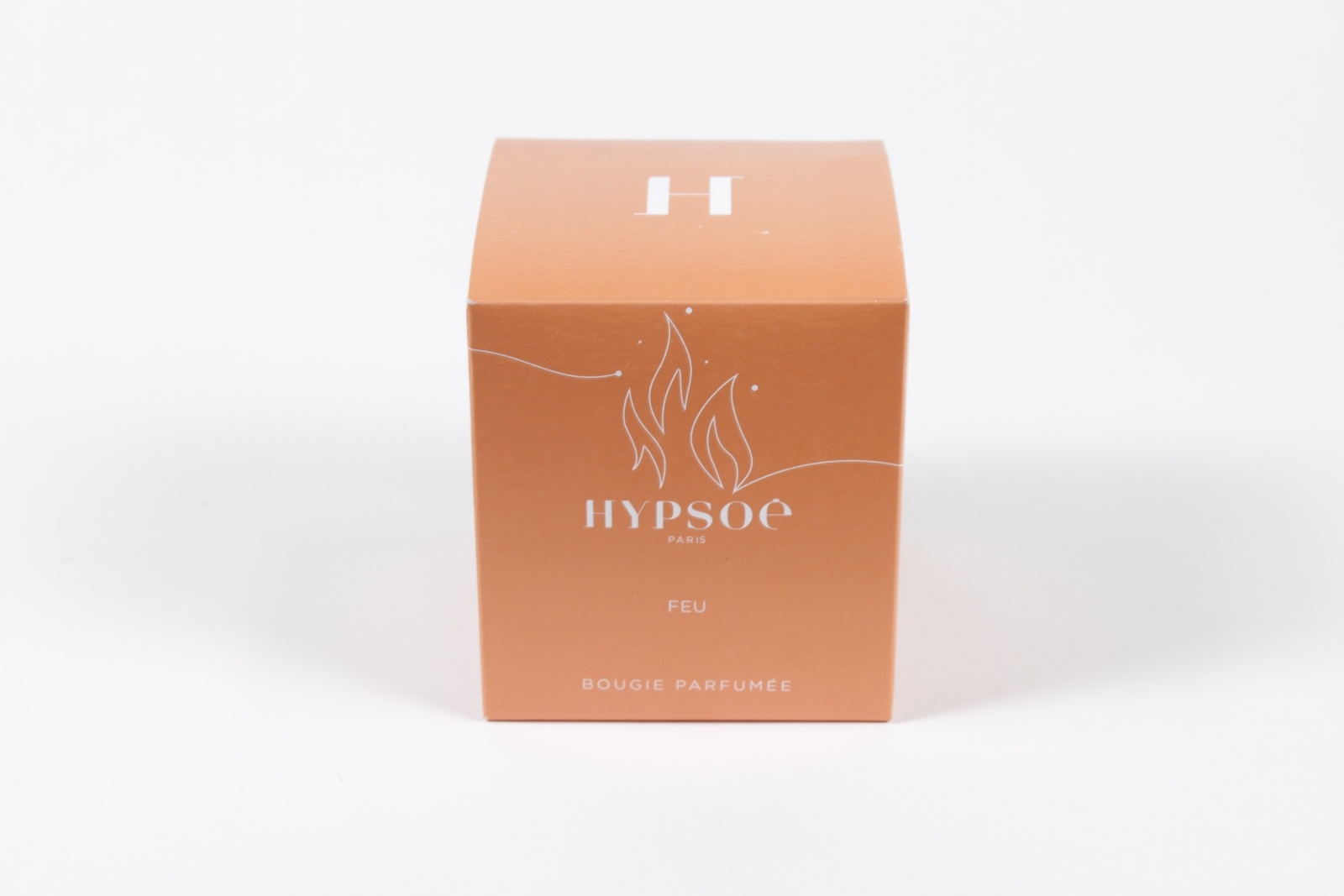 White and orange ceramic scented candle fire 240g diameter 8cm height 9.5cmComposition: Spicy accord, Cedar, Wood fire accordVegetable wax (and vegan) Lead-free cotton wickDuration: 45h approx.