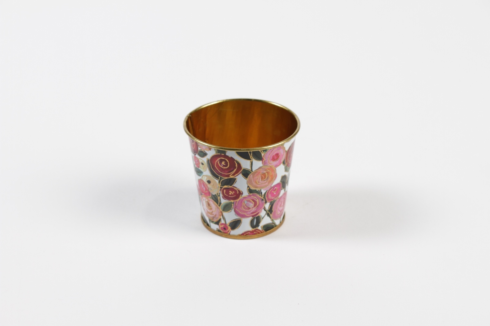 Ref. : MH-000011 White zinc plant pot with pink rose pattern, diameter 6.5cm, height 6cm