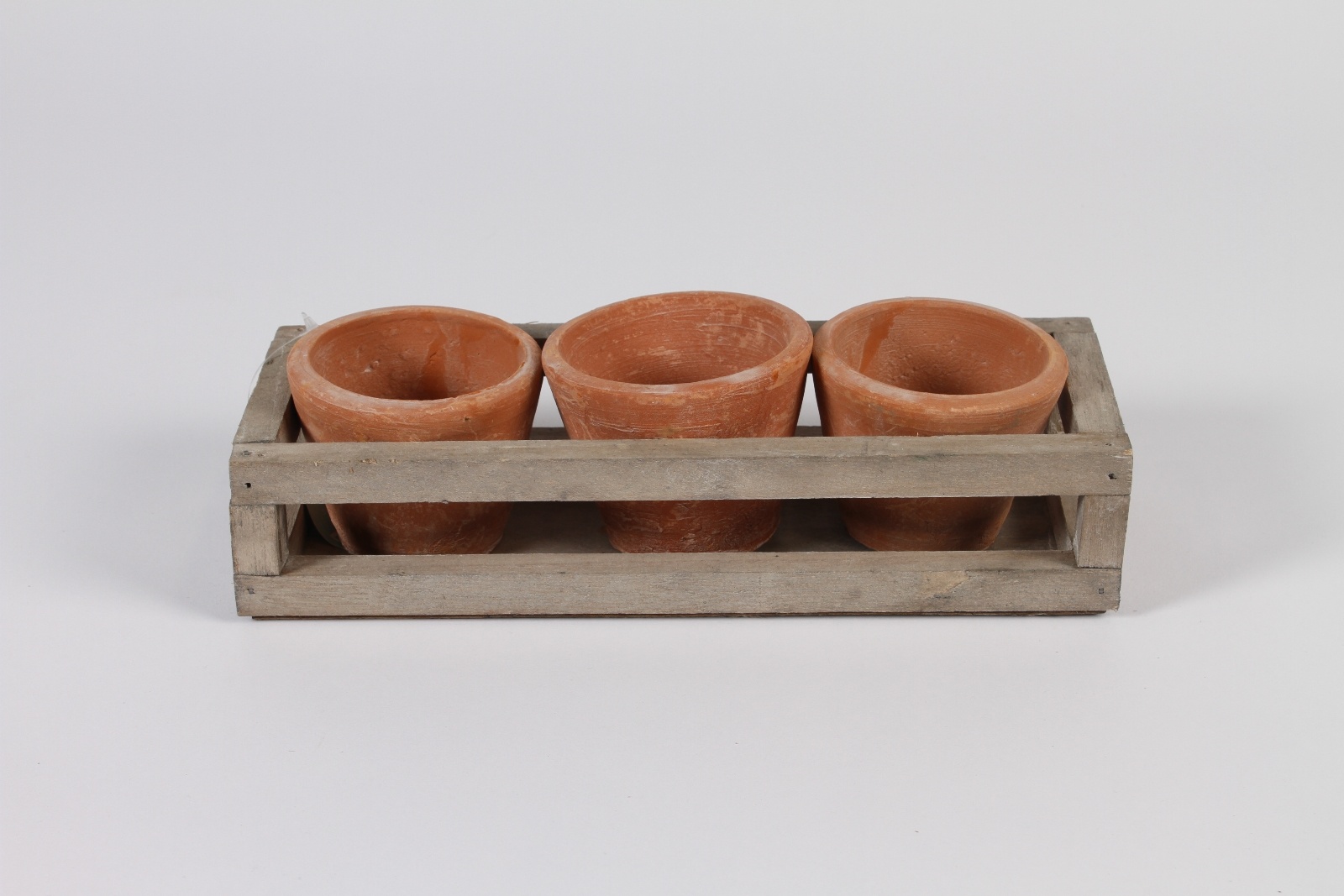Wooden box and 3 terra cotta potsbox: length 25.5cm width 10cm height 5cmPot: diameter 7.5cm height 6.5cm base 5cm
