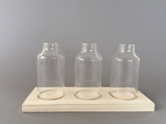 Wooden tray with clear glass domes or bell jarsWooden tray width 32cm length 12cm3 openned glass bells diameter 7.5cm height 15cm